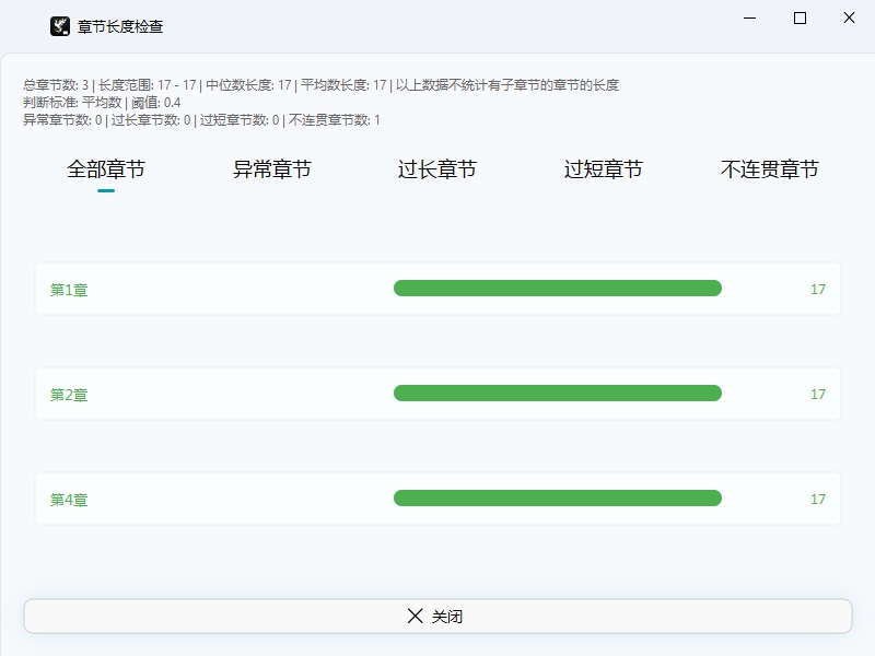 长度检查 会统计所有没有子章节的章节的长度,分为 全部章节 、 异常章节 、 过长章节 、 过短章节 和 不连续章节 5 个内容。判断异常的标准在设置页面可以修改。默认是用平均数,阈值 0.4 。