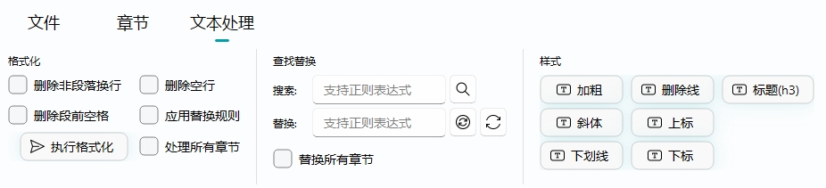 功能如其名。其中 删除空行 和 删除段前空格 在拆分章节时会自动应用。